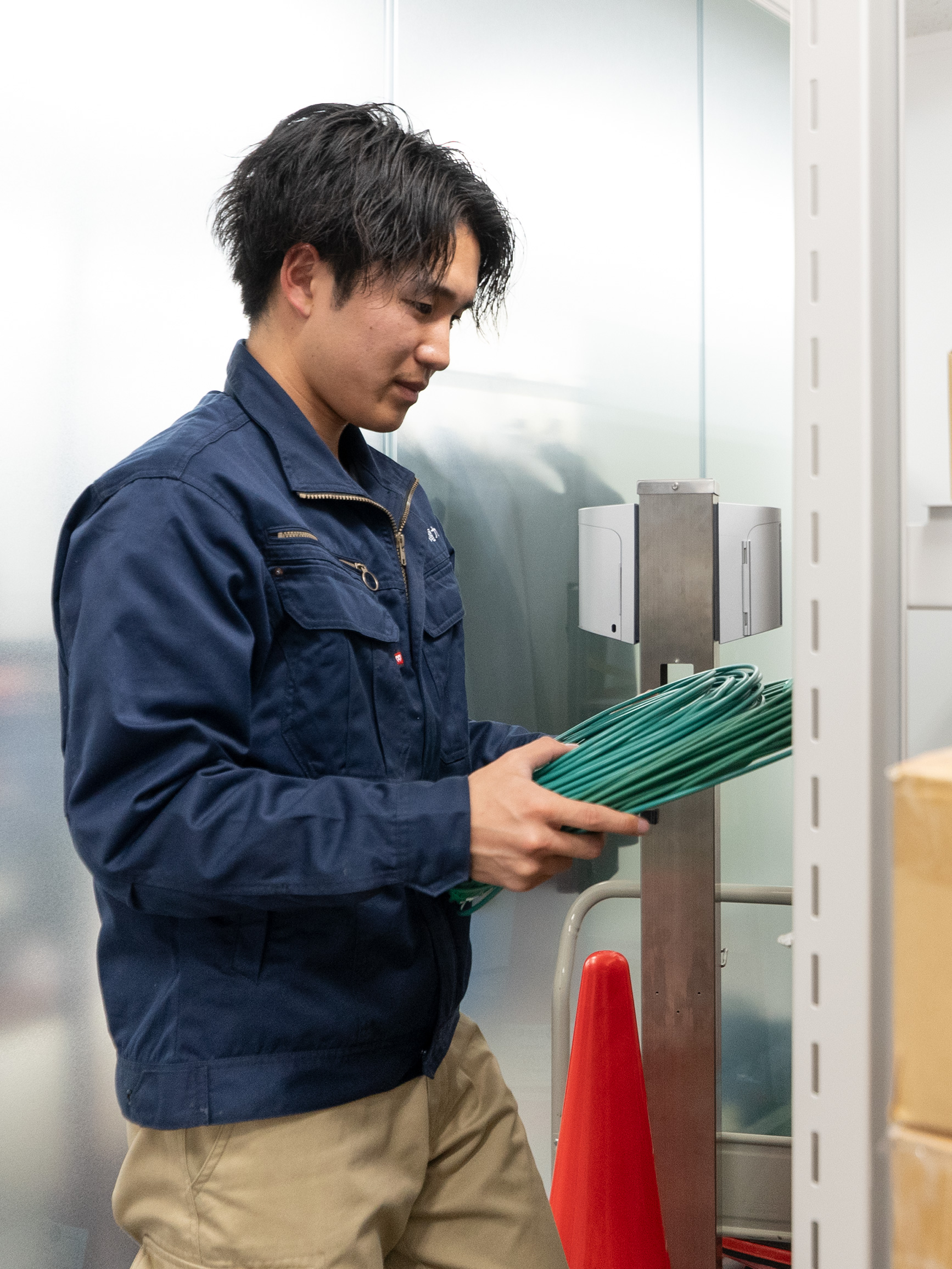 前職ではエレベーターなどのメンテナンスをしていて、ワイヤーを取り替えたり、基盤を変えたり、いわば「箱」の中の世界だけだったんです。でも日本電力に転職してからは、特に太陽光発電設備などは規模的にも大きいので、何もなかった土地に設備が出来あがった様子を見ると壮観ですし、気持ちがいいですね。EV充電器やキュービクルでも真新しい機器が設置されるので、できたときの気持ち良さは同じようにあります。