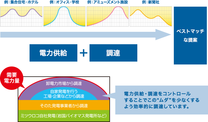 様々な需要電力を組み合わせることでムダのない効率がよい電力を提供します。