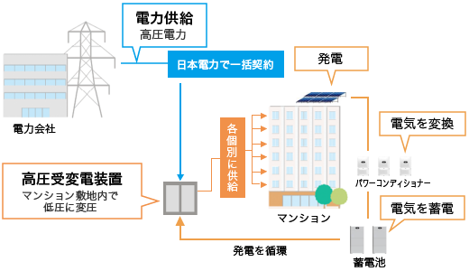 太陽光で発電した電気は電力会社に売電せず、マンション内にて循環、自家消費をします。
